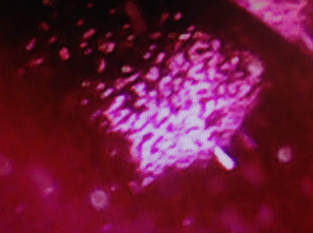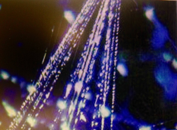 2、碎裂的丝绢状包裹体。虽然随出产地的不同宝石中的丝娟状包裹体可能多寡不一、长短不一,但金红石出容物是许多刚玉宝石的主要包裹体。在摄氏1200-1900°的高温下出熔的金红石纤维必然被溶蚀,成为绵延的省略号似的点状包裹体,宝石失去丝绢光泽(反射光下)。(如图5.2.2)