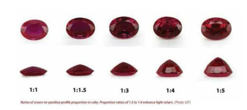 切工是相对比较难评级的,主要从四个方面考虑:火彩(brilliance)、台面的比例、总体比例和对称性。当从台面观察时,火彩低于整颗宝石的20%时则不能用于“鸽血红”、“皇家蓝”和“矢车菊蓝”的评级。当石头切割的比例在1:1.5和1:4之间时被认为是很好到好(图 6)。