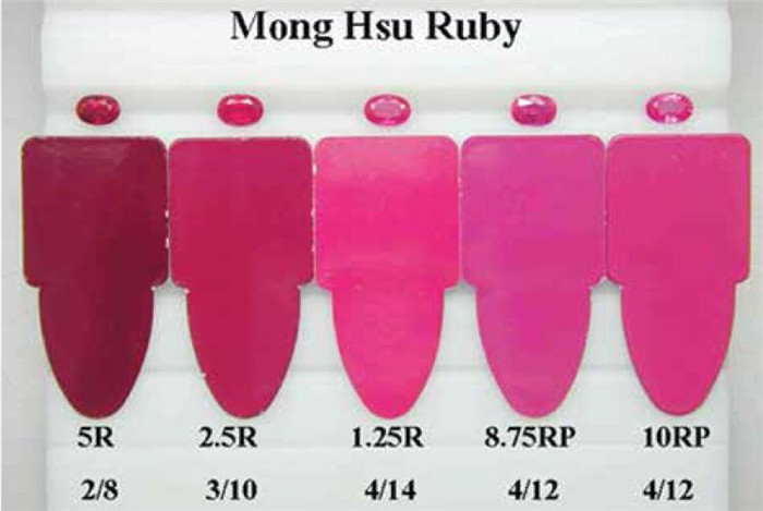 鸽血红和皇家蓝比色石的颜色如插图,标定了在宝石交易中常见的颜色。通过标准化这些颜色,希望可以增加消费者的信心。