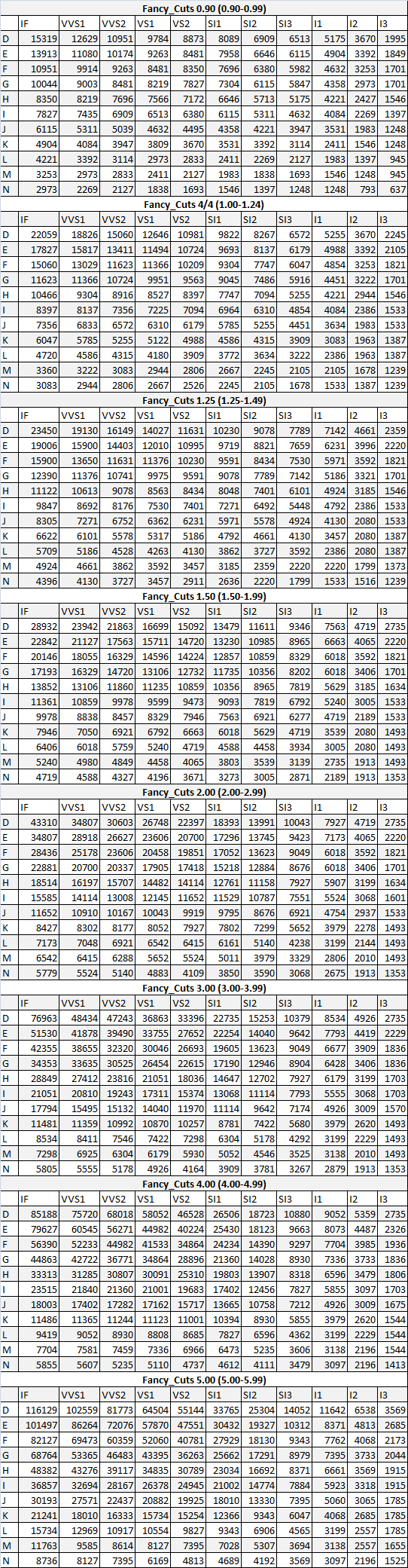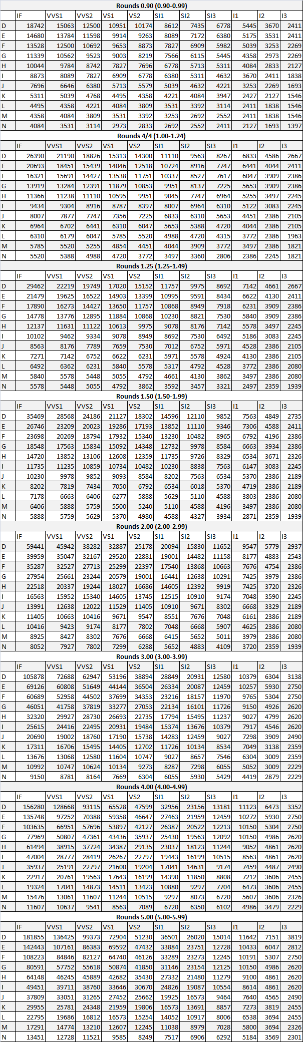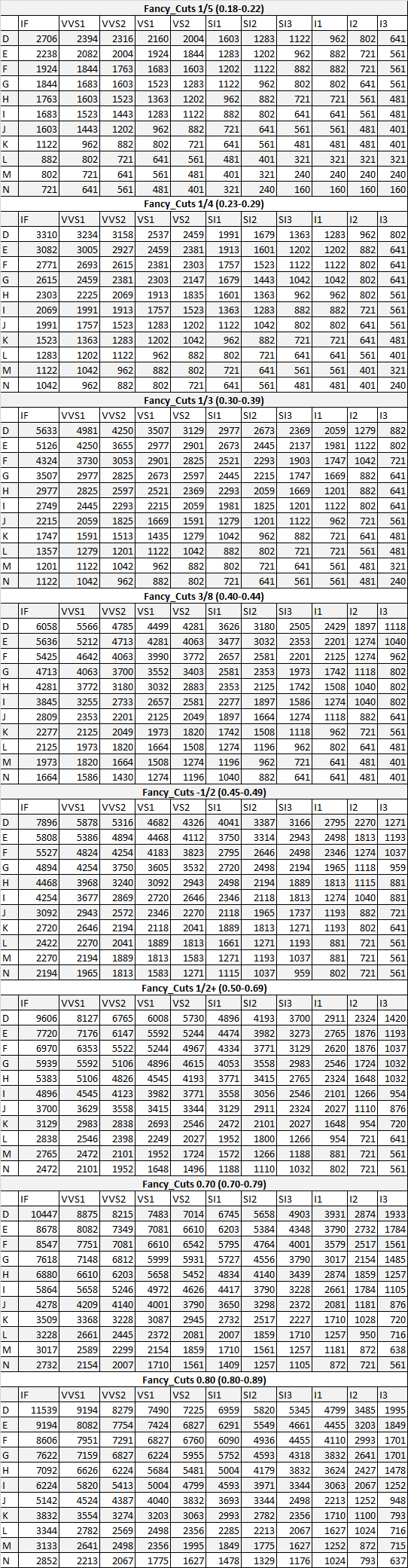该报价表根据4C分级给出钻石零售的建议,所列出的报价代表目前市场上成交的高位零售价,以此为不同商业模式的商家留出足够的空间。该报价表仅作为一种参考的背景信息,实际交易价格由卖家决定。
