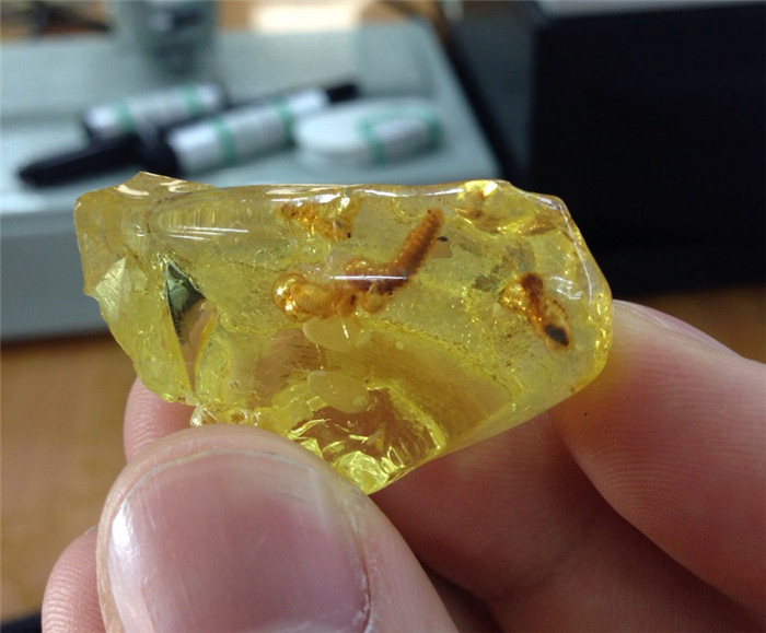 ⑥硬度。摩氏硬度,琥珀Hm=2~2.5,缅甸琥珀可达3。柯巴树脂Hm=1.5~2.0,易被指甲刻划。