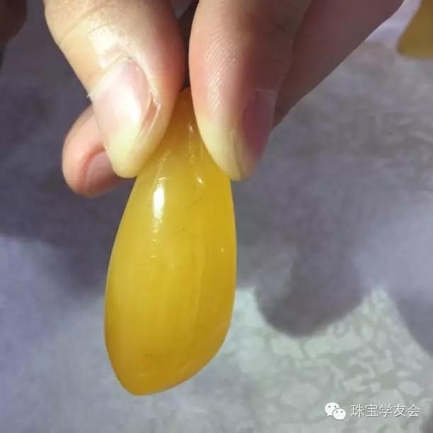 ④光泽及透明度。琥珀为树脂光泽,抛光后呈强树脂光泽,柯巴树脂为弱树脂光泽。前者为不透明-透明,后者多为透明。
