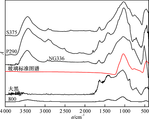 采用 Thermo fisher iS5 傅里叶变换红外光谱仪透射法测试5个不同产地渠道的珐琅釉料(800、NG336、大黑、S383、P290)。样品与溴化钾(KBr)以1:150(质量比)比例混合,并使用玛瑙研钵将其充分研磨,测试条件:扫描范围为400~4 000cm-1,分辨率为8cm-1,扫描次数12。