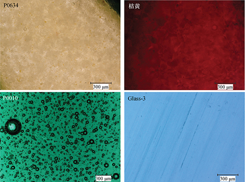 将烧制完成的珐琅样品及铅玻璃样品在显微镜下放大200倍观察其内部的特征(图4)。在同样的照明条件及放大倍数下,P0634样品可见少量气泡,透明度差,并伴随有颗粒状的染料没有发生熔融;桔黄色样品透明度差,可观察到釉料发生了部分熔融,颜色不均匀,呈斑块状;P0010样品内部可以观察到大量的气泡,具有良好的透光性,颜色均一,总体和玻璃一样。铅玻璃(Glass-3)放大观察其透光性好,且颜色均一、气泡少。