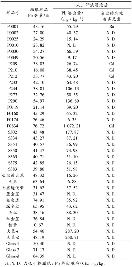 对35件烧制在银板上的珐琅色版,使用人工汗液浸泡168 h(7天),用于模拟人体正常佩戴的条件,并使用 ICP-OES 测试有害元素的溶出量。人工汗液配方使用《首饰 镍释放量的测定》(GB/T 19719—2005)中的配方[5]。