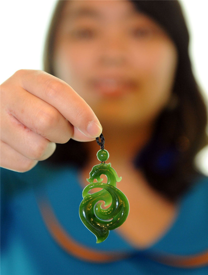 ▲四会市汇玉堂工作人员展示抽象派龙形纹的碧玉“王者归来”系列美玉。新华社记者周文杰摄