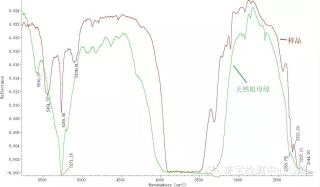 (2)根据文献[1],新型水热法合成祖母绿在在5000~5500 cm-1的范围内有3个吸收峰,在5448,5109cm-1处为Ⅰ型水,在5274cm-1处为Ⅱ型水,只是在峰的位置上略有区别,这可能是由于测量误差造成的。据图2对比分析,该样品存在5452、5109、5270cm-1特征吸收峰,与水热法合成祖母绿在该范围内的主峰基本吻合。