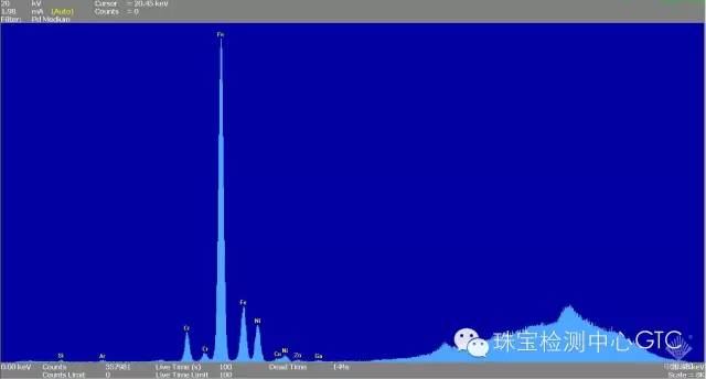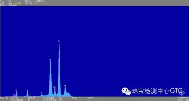 利用X射线荧光光谱仪,在8KV、20KV、40KV条件下对样品进行元素分析,可以得出样品富含Fe、Cr元素,含微量Ni、Cu元素,同时还发现少量Mn元素。(如图3~5)