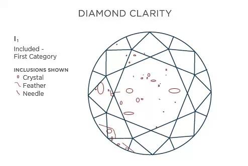 主要以十倍数放大镜观察钻石,透过鉴定师的眼光,根据钻石内含物而区分11等级。而内含物最常见为杂点、云雾状、羽毛状裂痕等,内含物主要影响光线折射,容易将光线阻挡或偏向,但其实Sl1等级以上的内含物肉眼都难以观察,不构成肉眼瑕疵。而只要挑选Sl1等级以上,即便有细微内含物也只选用几近白透色,且因为透度好,钻石光辉不会因杂点或黑色内含物而破碎零乱,同样的预算用来购买更大的钻石成为更好的配戴选择。