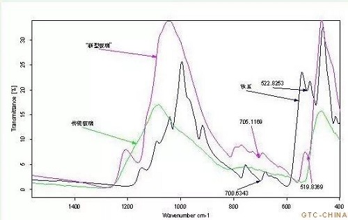 图2 “新型玻璃”、传统玻璃和软玉的红外图谱