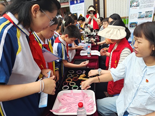 在活动现场,中诚的科普人员精心布置了科普展位,利用图文展板、实物样本及便携检测工具,生动揭示了珠宝玉石的生成奥秘、独特属性及先进检测技术。他们采用通俗易懂的语言,详细解释了显微镜观察宝石内部结构的方法及紫外灯下宝石的荧光反应原理。科普人员还通过真假珠宝的直观对比,向孩子们传授区分天然与合成宝石的实用技巧。孩子们聚精会神地观察着,不时发出惊叹声,他们的好奇心和求知欲在这里得到了充分的满足。