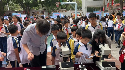 2025年4月18日上午,广州市越秀区先烈中路小学的操场上,科技月活动如火如荼地展开。作为特邀参展单位,我单位以“珠宝首饰鉴定师”为主题,通过设置趣味科普摊位和互动体验环节,为学生们呈现了一场别具一格的科学盛宴,吸引了众多师生驻足参与。孩子们的脸上洋溢着兴奋与好奇,他们围绕在摊位前,聆听着科普人员的讲解,眼睛里闪烁着对未知世界的渴望。