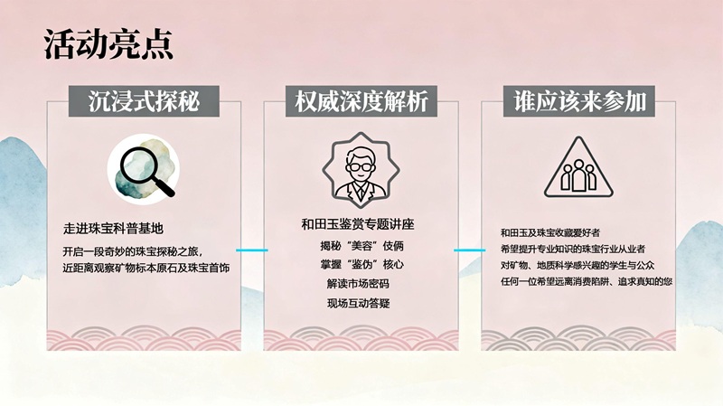(1)揭秘“美容”伎俩:系统梳理市面上常见的和田玉优化处理技术,如“染色”“上蜡(上油)”“拼合”等,用高清图片与实物案例,展示其手法与鉴定特征。 (2)掌握“鉴伪”核心:了解运用肉眼观察、放大检查、光谱分析等科学鉴定方法,像侦探一样,从细微之处寻找“破绽”,辨别天然与处理品的本质区别。(3)解读市场密码:深入探讨优化处理对和田玉价值的影响,帮助您在收藏与消费中做出明智判断。 (4)现场互动答疑:您可将家中珍藏的玉器带来(请妥善保管),专家将提供初步的观察意见,并与您面对面交流鉴定心得。 3、谁应该来参加? 和田玉及珠宝收藏爱好者 希望提升专业知识的珠宝行业从业者; 对矿物、地质科学感兴趣的学生与公众 任何一位希望远离消费陷阱、追求真知的您 报名方式: 本次活动为公益性质,名额有限,敬请提前预约。